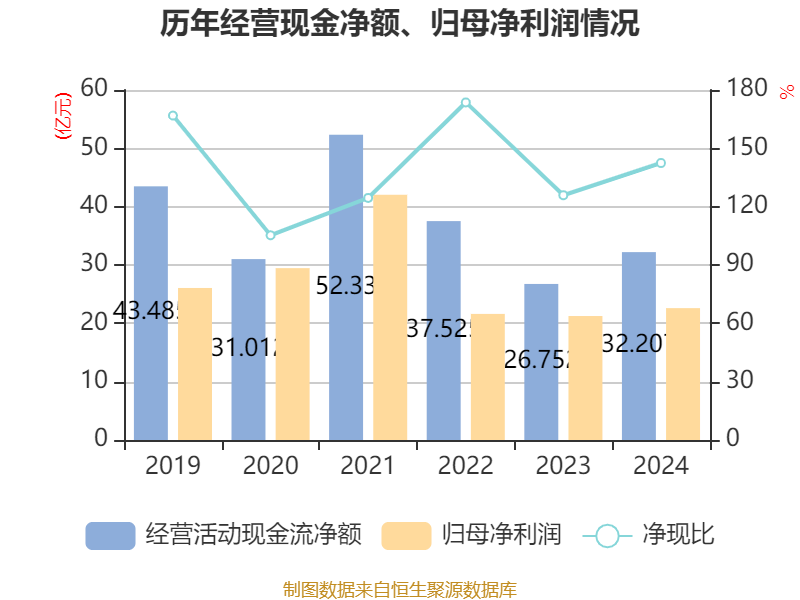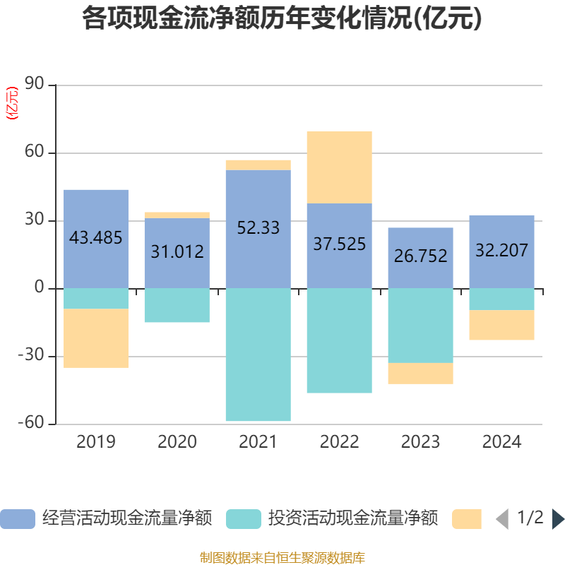 截至2024年,公司经营活动现金流净额为32.21亿元,同比增长20.39%;筹资活动现金流净额-13.17亿元,同比减少3.82亿元;投资活动现金流净额-9.76亿元,上年同期为-33.1亿元。