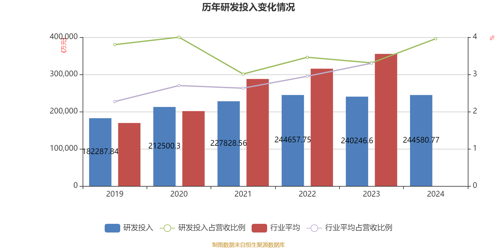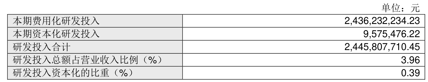 2024年全年,公司研发投入金额为24.46亿元,同比增长1.8%;研发投入占营业收入比例为3.96%,相比上年同期上升0.65个百分点。此外,公司全年研发投入资本化率为0.39%。