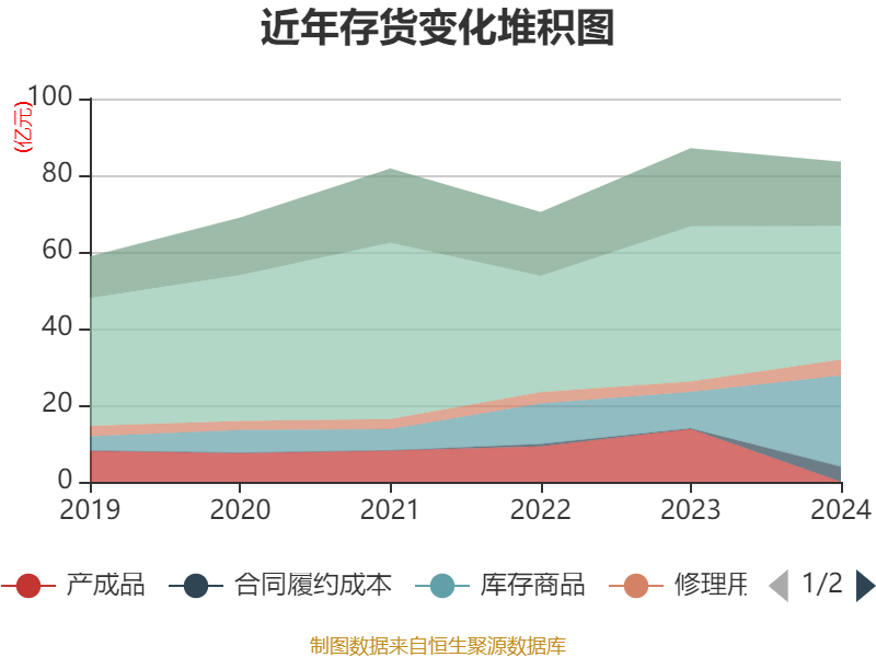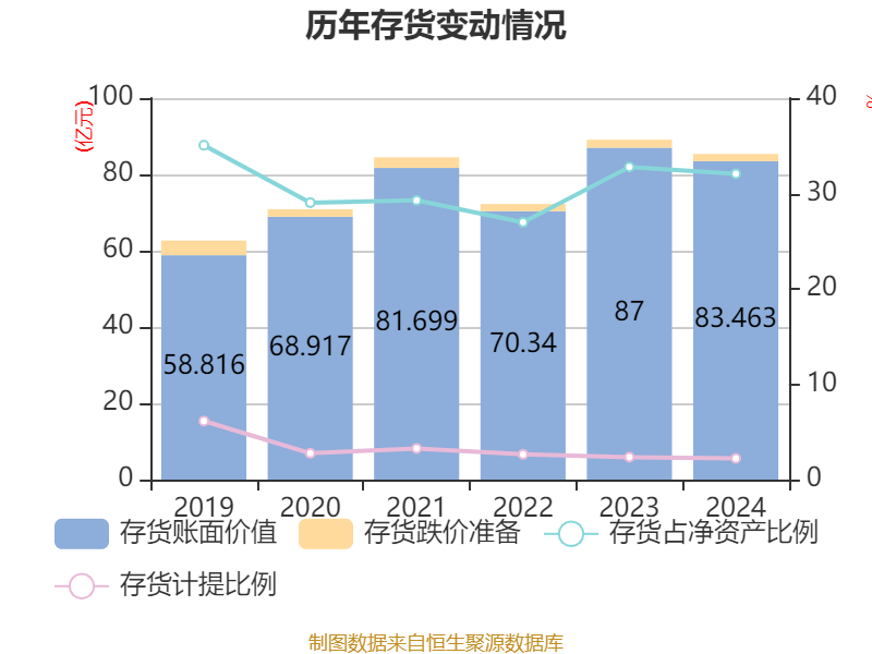 从存货变动来看,截至2024年末,公司存货账面价值为83.46亿元,占净资产的32.07%,较上年末减少3.54亿元。其中,存货跌价准备为1.9亿元,计提比例为2.22%。